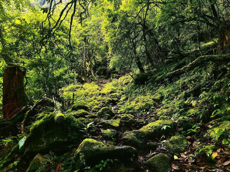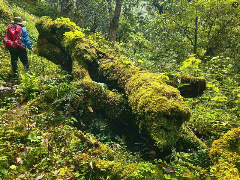 進(jìn)入山林深處,另一番景象引人入勝:山路鋪滿厚厚落葉,嶙峋怪石其間突起,石上覆蓋的碧綠苔蘚仿佛在靜靜訴說歲月滄桑。我們踩著松軟落葉繼續(xù)攀爬,雨滴自寬大葉片滑落,墜入葉堆,散發(fā)出腐葉與野花交織的獨特氣息。林間遍布古樹及五味子、黃精、天南星、重樓等珍稀藥材,與形態(tài)各異的奇花異草共同勾勒出碧羅雪山豐富的生物多樣性圖景。