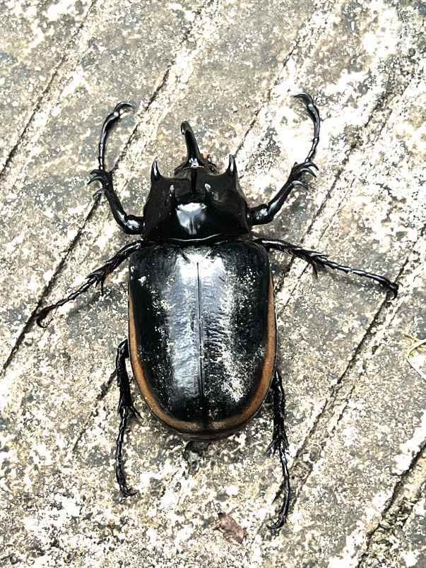 粗尤犀金龜金邊亞種是尤犀金龜屬的一種甲蟲,俗稱“金邊五角大兜”,因鞘翅邊緣棕色金邊狀特征得名。其鞘翅呈黑色,邊緣具棕色窄帶,形成“金邊”效果,雄蟲前胸背角粗短,近乎垂直;頭角向上彎曲,胸角發(fā)達(dá)。雄蟲體長42至80毫米,雌蟲體長30至50毫米。