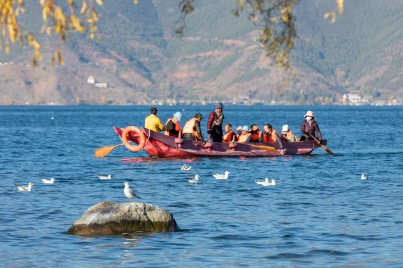 豬槽船劃開翡翠色的湖面,驚起一群紅嘴鷗;草海褪去蒼翠,蘆葦蕩在風(fēng)中翻涌成金色的浪;摩梭姑娘的百褶裙擺拂過棧道,風(fēng)中似乎響起了甲搓舞的旋律。