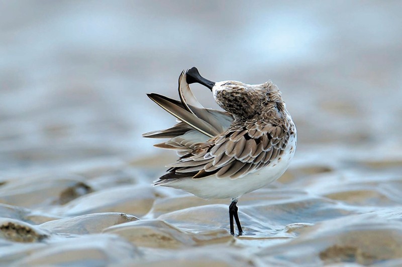 在這里勺嘴鷸那把獨特的“勺子”展現(xiàn)出它的妙用。最新研究發(fā)現(xiàn),它們喙部末端的特殊三角形結(jié)構(gòu),能夠在淺水中實現(xiàn)高效的夾食和濾食,就像一把活生生的“水中漏勺”。這種精妙的取食方式,讓它們能夠在單位時間內(nèi)獲取更多食物,快速恢復(fù)體力。在幾周內(nèi),它們的體重翻倍,并將身上殘損的紅棕色繁殖羽更換成灰白色的越冬羽,以便更好地進行接下來的遷徙。