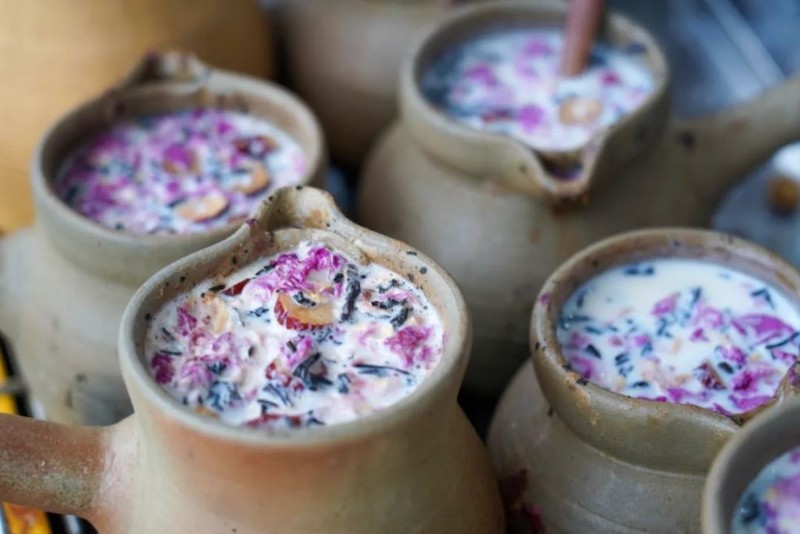 土罐烤奶,是在土罐中加入牛奶,再加入玫瑰花、紅棗片等輔料制作而成,奶香濃郁、花香撲鼻。