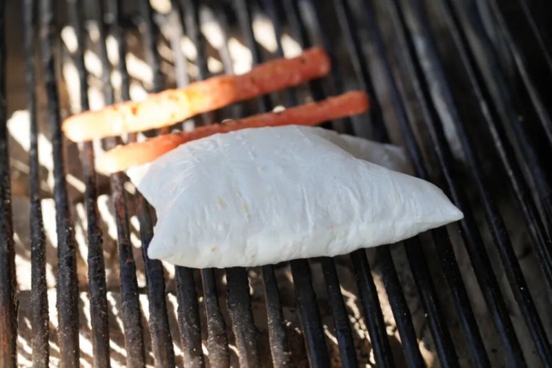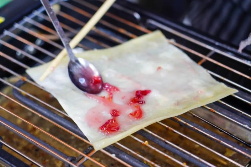 烤乳扇奶香味十足,當(dāng)?shù)厝诉吙具吢龑⑷樯绕戒伋蓧K狀,涂上煉乳或者玫瑰醬,邊卷邊烤,最后卷成筒狀。
