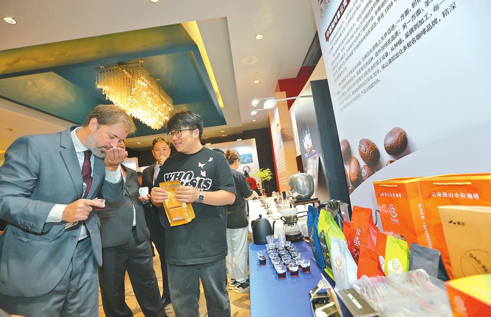 在云南與跨國企業(yè)對話會上,外國客商關(guān)注云南咖啡。 本報(bào)記者 黃興能 攝
