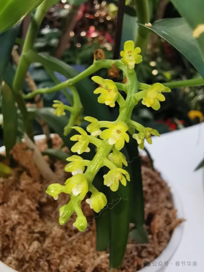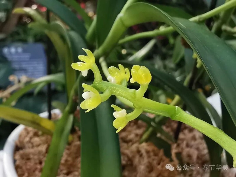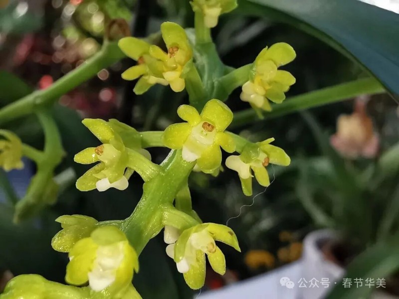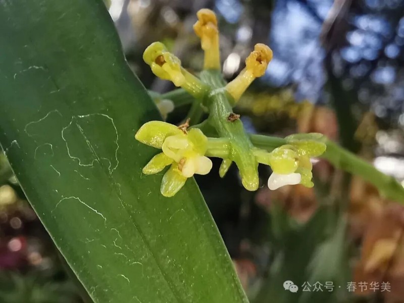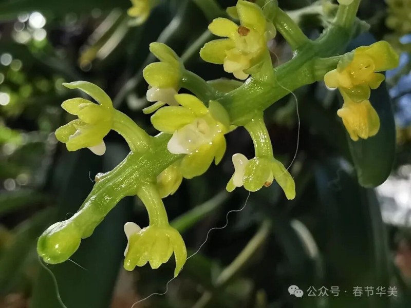 花序側(cè)生,與葉對(duì)生,比葉長或短,不分枝或具短分枝;總狀花序或圓錐花序具多數(shù)花;花苞片小,三角形,長約1毫米;花梗和子房長2-3毫米;花稍肉質(zhì),淡黃綠色;中萼片近橢圓形,凹的,長約4毫米,寬2.5毫米,先端鈍;側(cè)萼片近似于中萼片,稍較窄而歪斜,先端鈍;花瓣斜長圓形,長2.5-3.5毫米,寬約1.2毫米,先端鈍;唇瓣厚肉質(zhì),3裂;側(cè)裂片小,直立,斜三角形,先端銳尖;中裂片近半圓形,長約1毫米;距短而鈍,長約2毫米,內(nèi)面在背壁上方的胼胝體無毛,具不甚發(fā)達(dá)隔膜;蕊柱長約2毫米,基部具短的蕊柱足;藥帽前端稍收窄,先端鈍;粘盤柄纖細(xì),粘盤近圓形?;ㄆ?-9月。