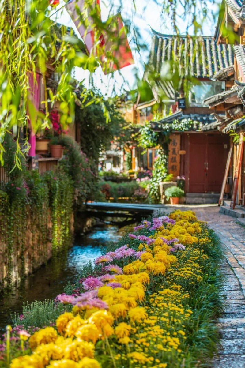 在麗江,處處皆是動人景致。清晨的玉龍雪山,晨霧如輕紗,積雪在暖陽下折射出細碎金光。麗江古城街巷被緋紅、明黃等各色菊花鋪滿,納西族民居前五星紅旗迎風(fēng)飄揚,將節(jié)日的熱鬧揉進古城的溫婉里。