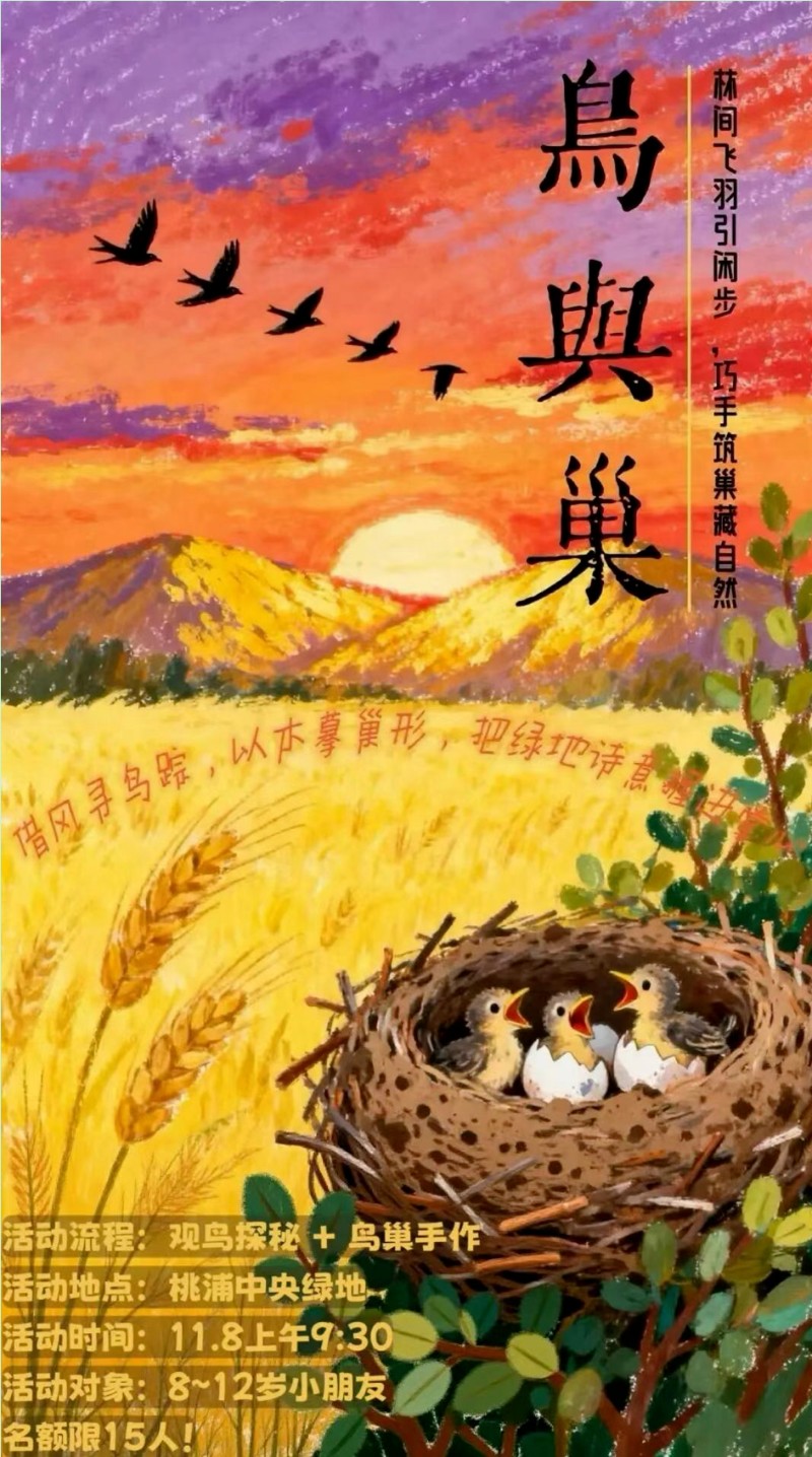 此次活動(dòng)由普陀區(qū)綠化市容局主辦、普陀區(qū)生態(tài)環(huán)境局協(xié)辦,帶你解鎖鳥(niǎo)類(lèi)與巢穴的自然奧秘,共赴一場(chǎng)守護(hù)生態(tài)的趣味之旅~以“鳥(niǎo)與巢”為切入口,在田野與公園中學(xué)習(xí)城市常見(jiàn)鳥(niǎo)類(lèi)的識(shí)別方法,理解不同巢型背后的生存智慧,并以自然材料完成一枚“仿生鳥(niǎo)巢”。在“觀察—理解—?jiǎng)?chuàng)作”的閉環(huán)中,讓孩子把“尊重生命、守護(hù)野生動(dòng)物”的理念帶回家。